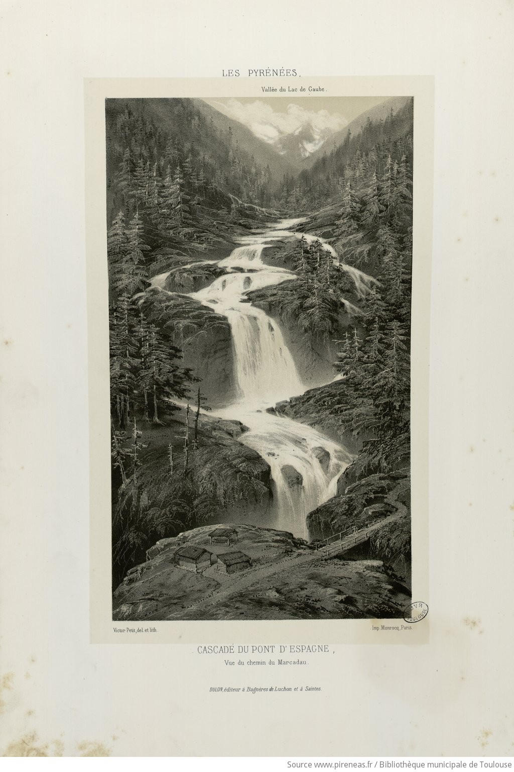 Cascade du pont d'Espagne. Lithographie de Victor Petit (éd. 1817-1871) (c) Bibliothèque municipale de Toulous