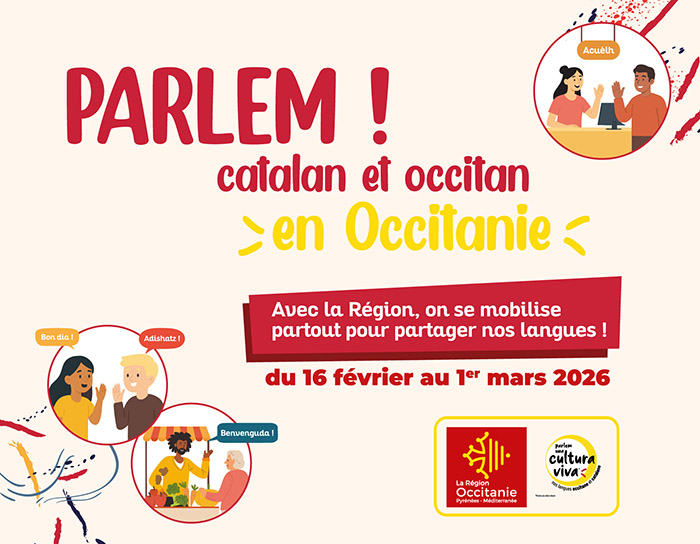 PARLEM ! Catalan et Occitan en Occitanie 2026 Paragraphe Paragraphe niveau 2 Titre Du 16 février au 1er mars 2026 Corps PARLEM ! Catalan et Occitan, c’est l’événement participatif qui n’a pas ses langues dans la poche. Habitants et acteurs du territoire vous proposent de partager nos langues catalane et occitane, patrimoines vivants d’Occitanie.Visites, balades, ateliers, rencontres… retrouvez tous les rendez-vous près de chez vous : https://jeparticipe.laregioncitoyenne.fr/project/plan-cultura-viva/collect/depot Corps Consulter le numéro bilingue français/catalan de Patrimoines du Sud : "Historicisme, éclectisme et régionalisme en Catalogne aux XIXe et XXe siècles" Média Image